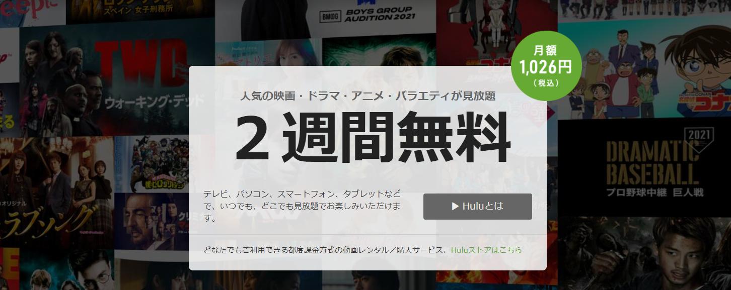 Huluは漫画など書籍の配信は行っていませんが、月額1,026円で7万本以上の動画が全て見放題で見ることができます。