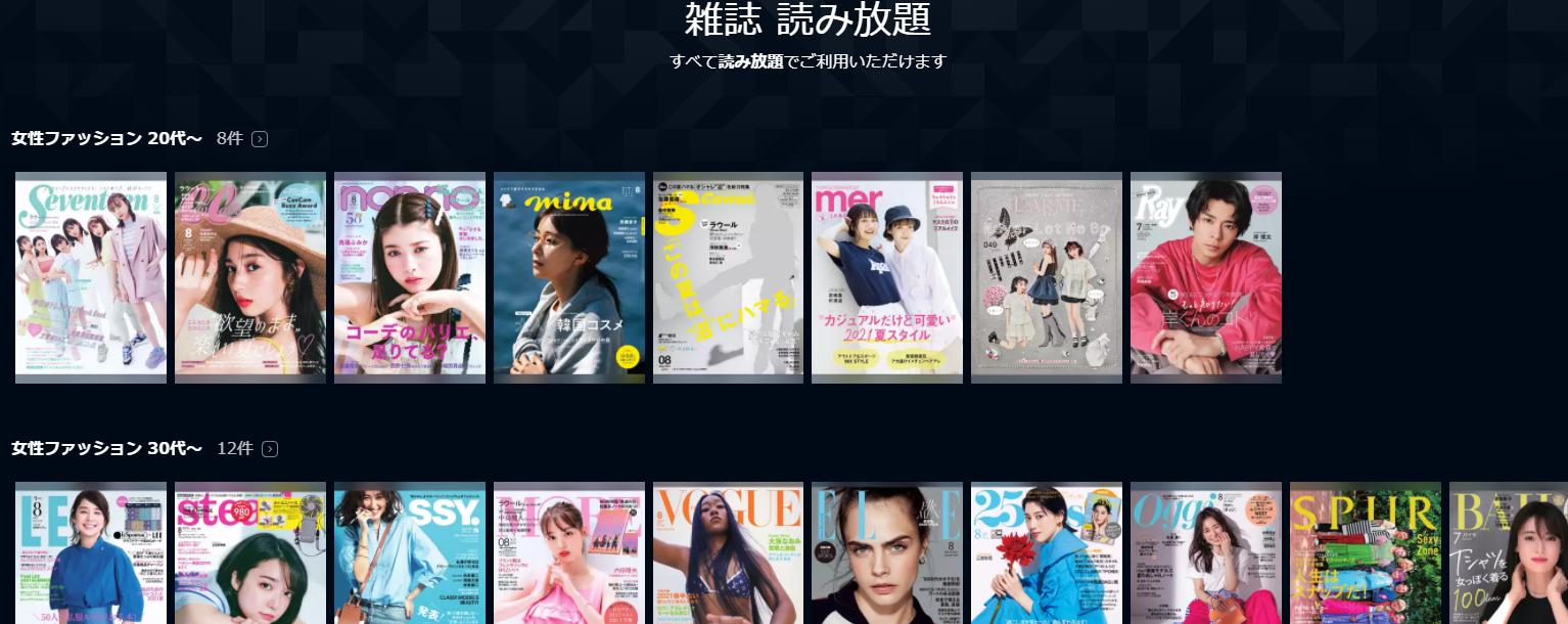 女性ファッション誌、男性ファッション誌、グルメ、趣味、ビジネス、週刊誌など全て読み放題。